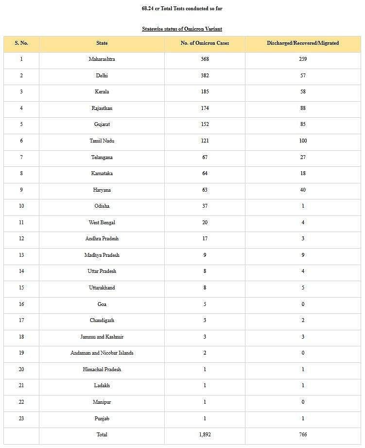 அதில், அதிகபட்சமாக மகாராஷ்டிரத்தில் 568 பேருக்கும், தில்லியில் 382 பேருக்கும், கேரளத்தில் 185 பேருக்கும் ஒமைக்ரான் பாதிப்பு உறுதி செய்யப்பட்டுள்ளது.
