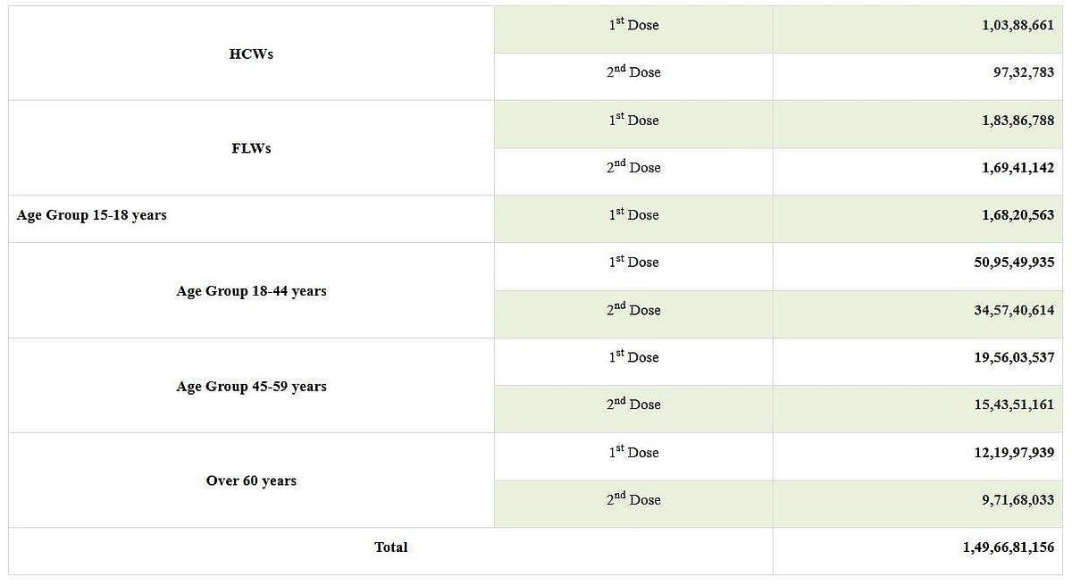 நாட்டில் கடந்த 24 மணிநேரத்தில் 94,47,056 தடுப்பூசிகள் செலுத்தப்பட்டதையடுத்து மொத்தம் 1,49,66,81,156 (இன்று காலை 7 மணிவரை) தடுப்பூசிகள் போடப்பட்டுள்ளது.
