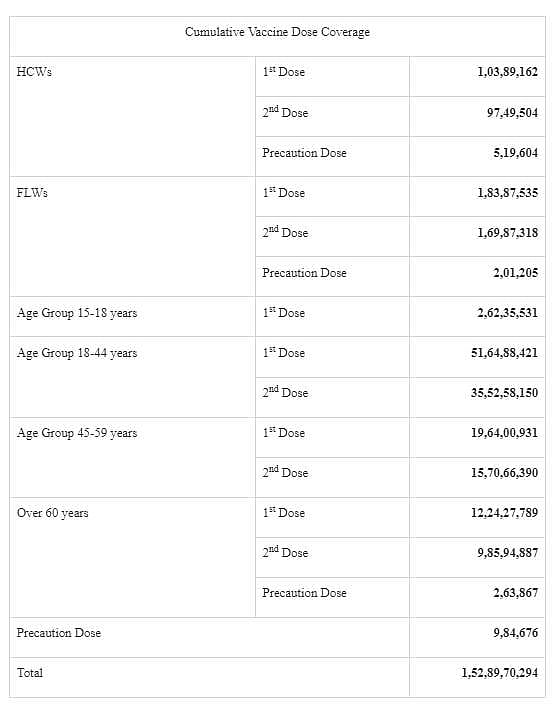 இந்தியாவில் இதுவரை 152.89 கோடி கரோனா தடுப்பூசிகள் செலுத்தப்பட்டுள்ளதாக மத்திய சுகாதாரத்துறை செவ்வாய்க்கிழமை தெரிவித்துள்ளது.