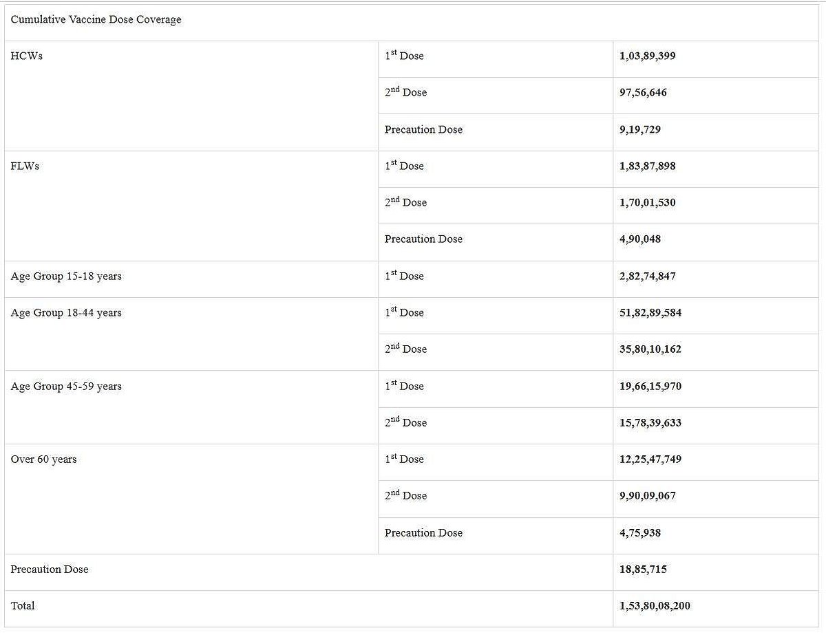 இந்தியாவில் இதுவரை 153.80 கோடி கரோனா தடுப்பூசிகள் செலுத்தப்பட்டுள்ளதாக மத்திய சுகாதாரத்துறை புதன்கிழமை தெரிவித்துள்ளது.