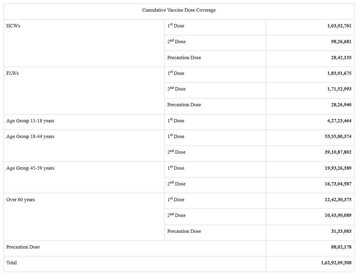 இந்தியாவில் இதுவரை 162.92 கோடி கரோனா தடுப்பூசிகள் செலுத்தப்பட்டுள்ளதாக மத்திய சுகாதாரத்துறை செவ்வாய்க்கிழமை தெரிவித்துள்ளது.