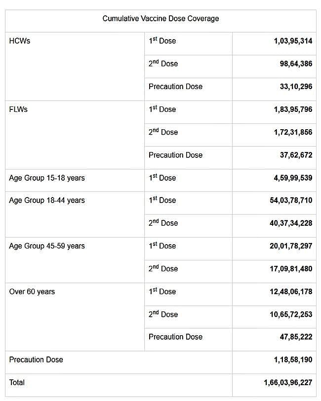 இந்தியாவில் இதுவரை 166.03 கோடி கரோனா தடுப்பூசிகள் செலுத்தப்பட்டுள்ளதாக மத்திய சுகாதாரத்துறை திங்கள்கிழமை தெரிவித்துள்ளது.