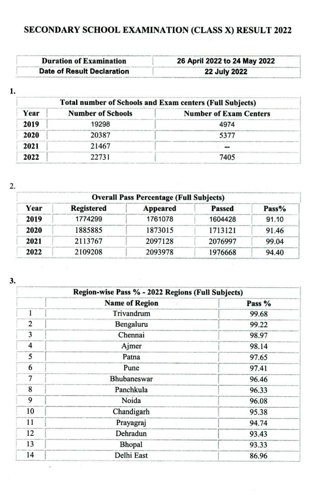 இதில், 99.68% தேர்ச்சியுடன் திருவனந்தபுரம் மண்டலம் முதலிடத்தைப் பிடித்துள்ளது. 99.22% தேர்ச்சியுடன் பெங்களூரு மண்டலம் இரண்டாமிடமும், 98.97% தேர்ச்சியுடன் சென்னை மூன்றாமிடமும் பெற்றுள்ளது.