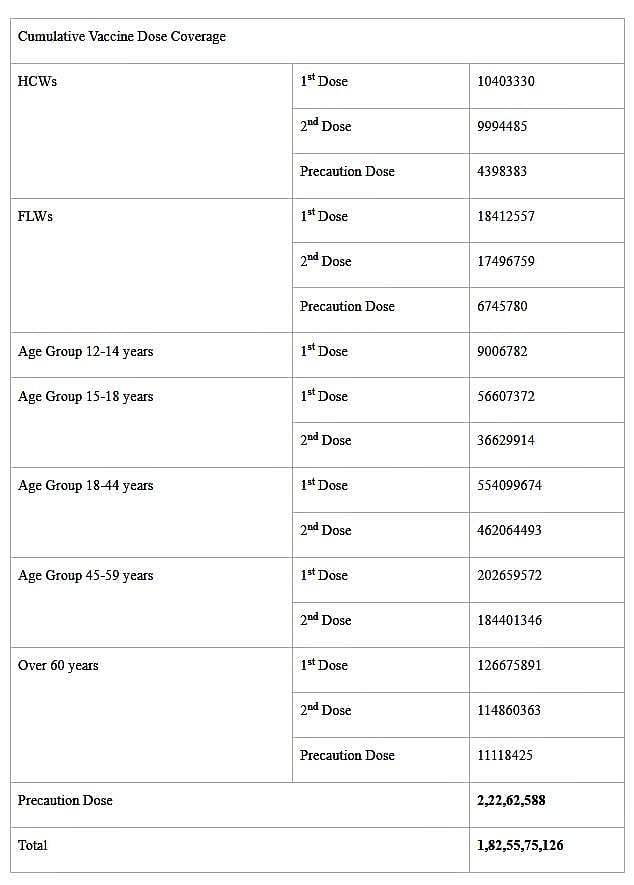 நாட்டில் 12 முதல் 14 வயதுக்குட்பட்டவர்களுக்கு 90,06,782 தடுப்பூசிகள் செலுத்தப்பட்டுள்ளன. இதையடுத்து இன்று காலை 7 மணி நிலவரப்படி மொத்தம் 1,82,55,75,126 கோடி தடுப்பூசிகள் போடப்பட்டுள்ளது.