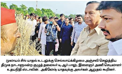 உத்தர பிரதேச முன்னாள் முதல்வா் முலாயம் சிங் யாதவின் இறுதி ஊா்வலத்தில் பங்கேற்ற அவரது மகனும் சமாஜவாதி கட்சித் தலைவருமான அகிலேஷ் யாதவ் மற்றும் கட்சித் தொண்டா்கள், பொதுமக்கள்.