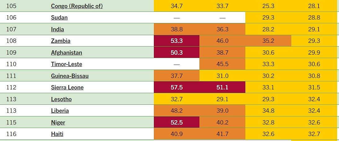 121 நாடுகளுக்கான இந்த பட்டியலில், இந்தியா 107-வது இடத்திற்கு பின்தங்கியுள்ளது. கடந்த 2020-ஆம் ஆண்டு 94-வது இடத்திலும் 2021 ஆம் ஆண்டு 101-வது இடத்திலும் இந்தியா இருந்த நிலையில் தற்போது மேலும் பின்தங்கியுள்ளது.