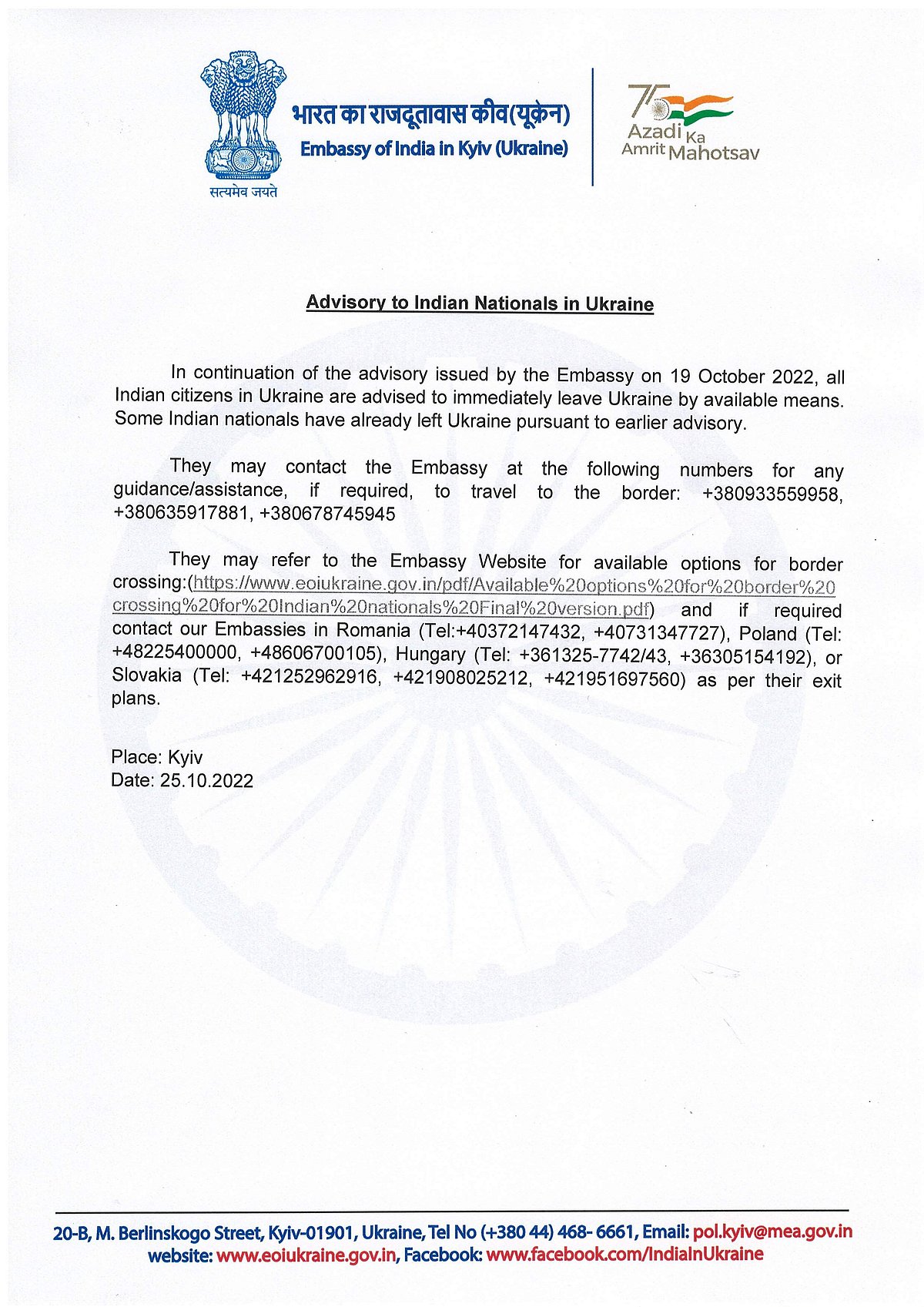 இந்தச் சூழலில், உக்ரைனில் நிலைமை மோசமடைந்து வருவதால், நாட்டின் பல்வேறு பகுதிகளில் வசிக்கும் இந்தியா்கள் கிடைத்த வாகனங்கள் மூலமாக உடனடியாக நாட்டைவிட்டு வெளியேறுமாறு கடந்த அக்டோபர் 19ஆம் தேதி இந்திய தூதரகம் கேட்டுக்கொண்டது.