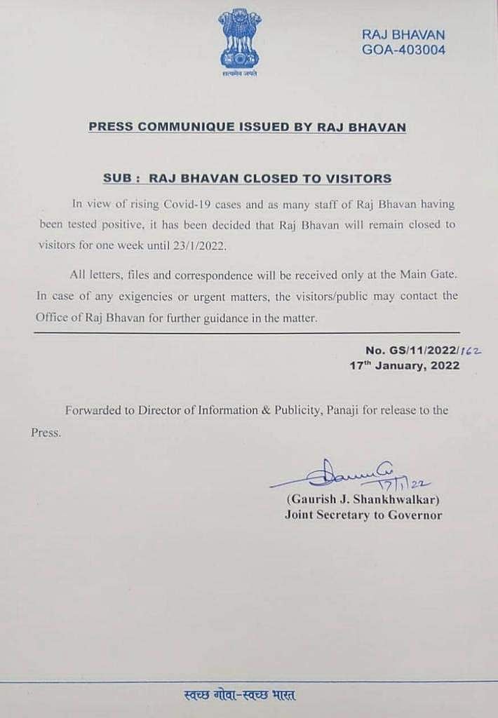 கோவா ஆளுநர் மாளிகையில் ஊழியர்கள் பலருக்கும் கரோனா பாதிப்பு உறுதி செய்யப்பட்டுள்ளதால் வருகிற ஜனவரி 23 ஆம் தேதி வரை மூடப்படுவதாகவும் பார்வையாளர்கள் அனுமதிக்கப்படமாட்டார்கள் எனவும் அதேநேரத்தில் ஆளுநர் மாளிகைக்கு வரும் கடிதங்கள், ஆவணங்கள் மட்டும் மெயின் கேட்டில் வாங்கப்படும் என்றும் ஆளுநரின் இணைச் செயலாளர் கௌரிஷ் ஜே. சங்க்வால்க்கர் அறிக்கை வெளியிட்டுள்ளார்.
