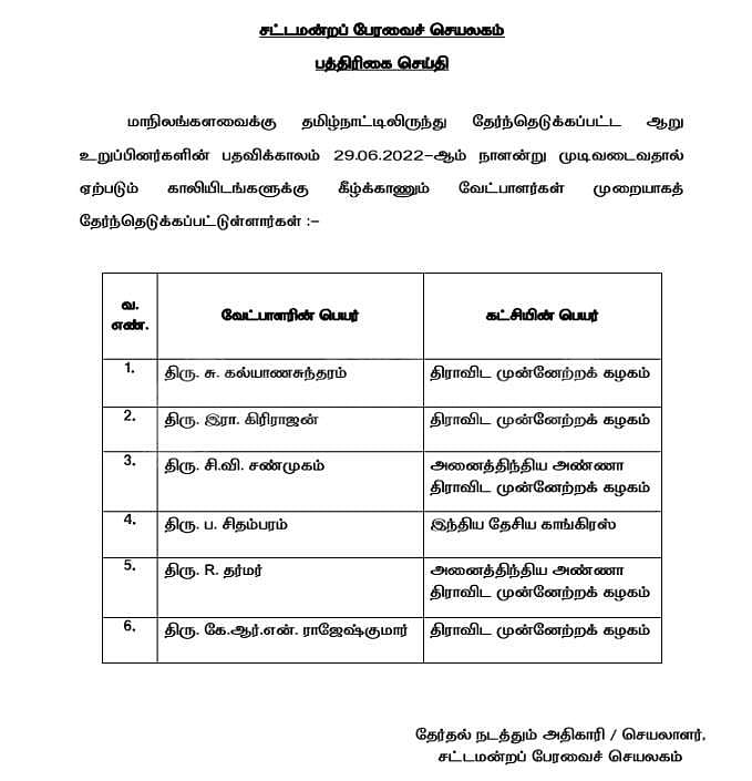திமுக சாா்பில் போட்டியிட்ட சு.கல்யாணசுந்தரம், கே.ஆா்.என்.ராஜேஷ்குமாா், ஆா்.கிரிராஜன் ஆகியோரும், அதிமுக சாா்பில் சி.வி.சண்முகம், ஆா்.தா்மா், காங்கிரஸ் கட்சி சாா்பில் ப.சிதம்பரம் ஆகியோா் போட்டியின்றி தேர்வு செய்யப்பட்டுள்ளதாக அறிவிக்கப்பட்டுள்ளது.