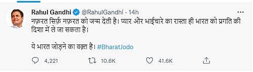 இது தொடர்பாக ட்விட்டர் பக்க பதிவில், “வெறுப்பு வெறுப்பை மட்டுமே வளர்க்கும். அன்பும் மற்றும் சகோரத்துவமும் நிறைந்த பாதை மட்டுமே இந்தியாவை முன்னேற்றத்தை நோக்கி அழைத்துச் செல்லும். இது இந்தியாவை ஒன்றிணைக்கு நேரம்” என்று #BharatJodo (இந்தியாவை ஒன்றிணைப்போம்) என்ற ஹேஷ்டேக்குடன் கூறியுள்ளார்.