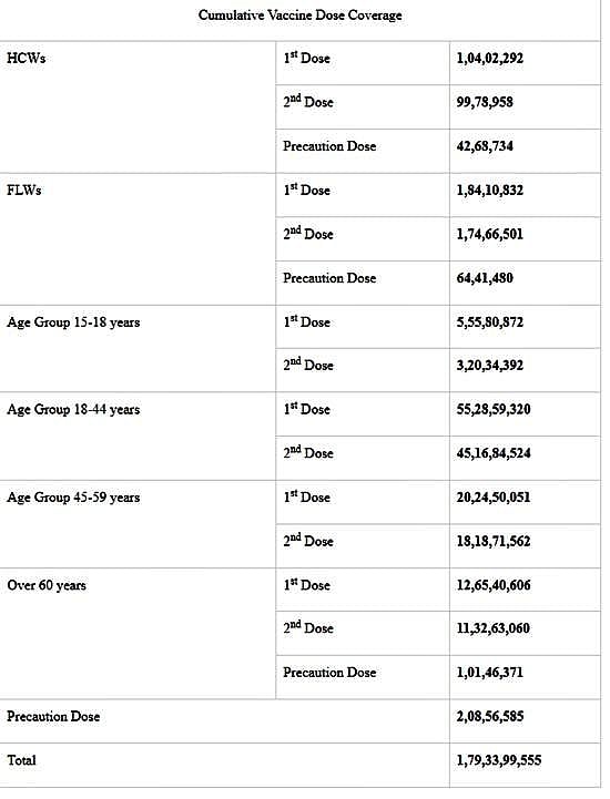 நாட்டில் இதுவரை 179.33 கோடி கரோனா தடுப்பூசிகள் செலுத்தப்பட்டுள்ளதாக மத்திய சுகாதாரத்துறை புதன்கிழமை தெரிவித்துள்ளது.