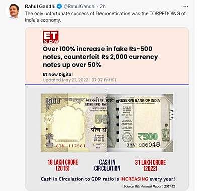 இந்நிலையில், காங்கிரஸ் மக்களவை உறுப்பினர் ராகுல் காந்தி சுட்டுரையில் வெளியிட்டுள்ள பதிவில், நாட்டின் பொருளாதாரத்தை மூழ்கடித்தது தான் பணமதிப்பிழப்பு நடவடிக்கையின் ஒரே துரதிர்ஷ்டவசமான சாதனை என்று குற்றம்சாட்டியுள்ளார்.