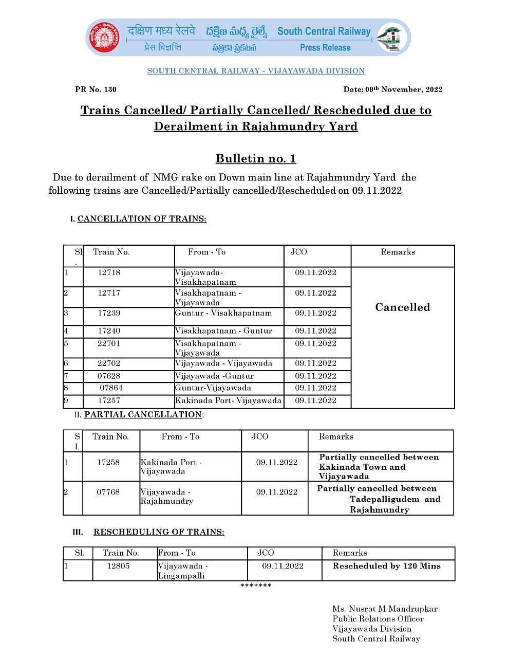 ரயில் தடம் புரண்டதால், இந்த வழிதடத்தில் இயக்கப்படும் 9 ரயில்கள் முழுமையாகவும், 2 ரயில்கள் பகுதி அளவிலும் ரத்து செய்யப்படுவதாக ரயில்வே நிர்வாகம் அறிவித்துள்ளது.