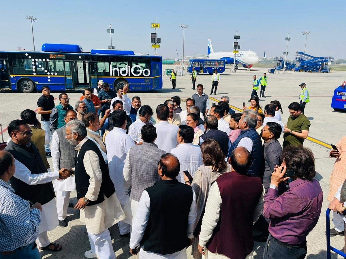 தில்லி விமான நிலையத்தில் இண்டிகோ விமானத்தின் முன்பு காங்கிரஸ் தலைவர்கள் போராட்டம் நடத்தி வருவதால் பரபரப்பான சூழல் நிலவுகிறது.