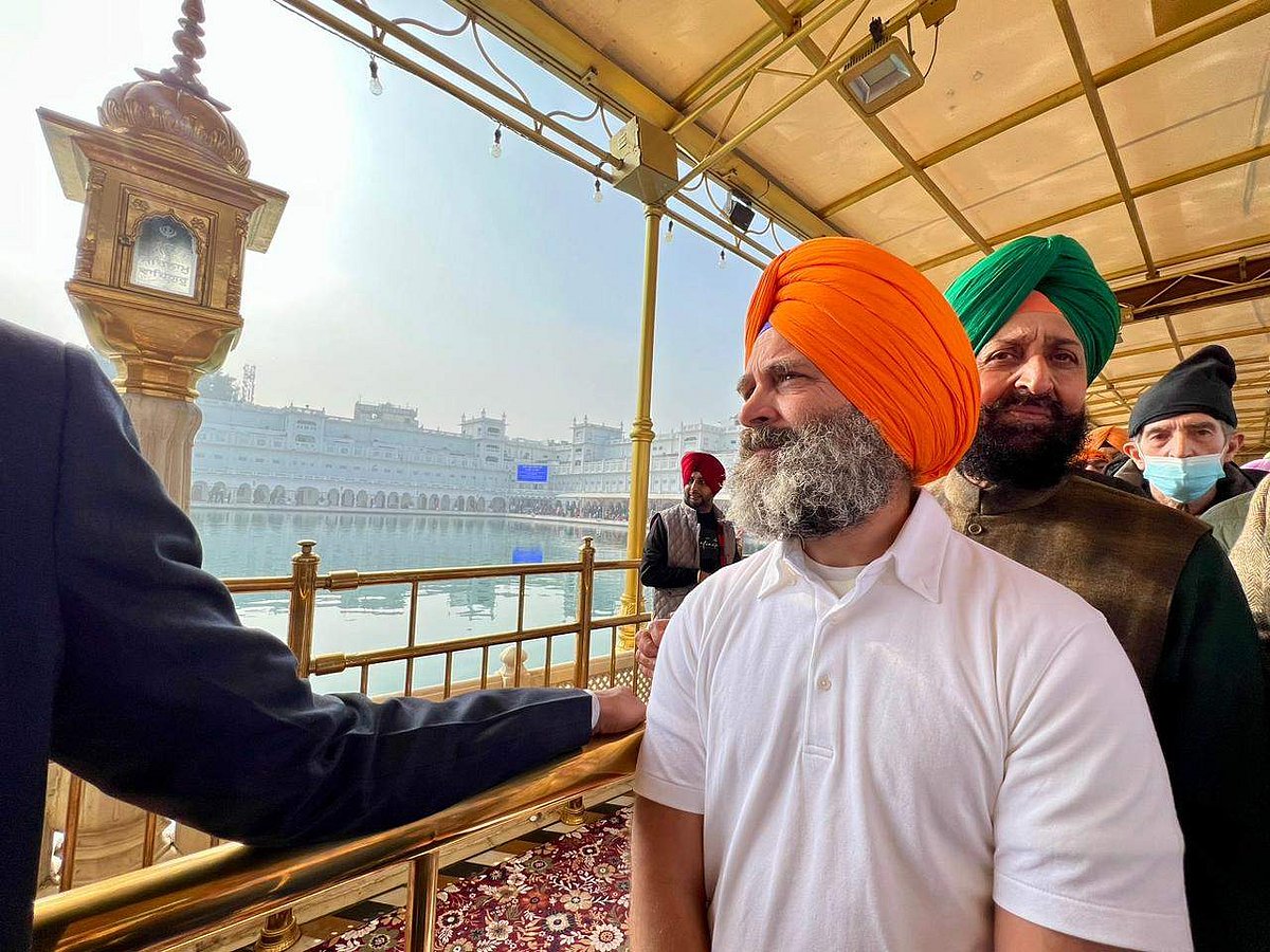 பொற்கோயிலுக்குச் சென்ற ராகுல் காந்தி, காவி நிற தலைப்பாகை அணிந்துச் சென்று பூஜைகளிலும் கலந்துகொண்டார்.