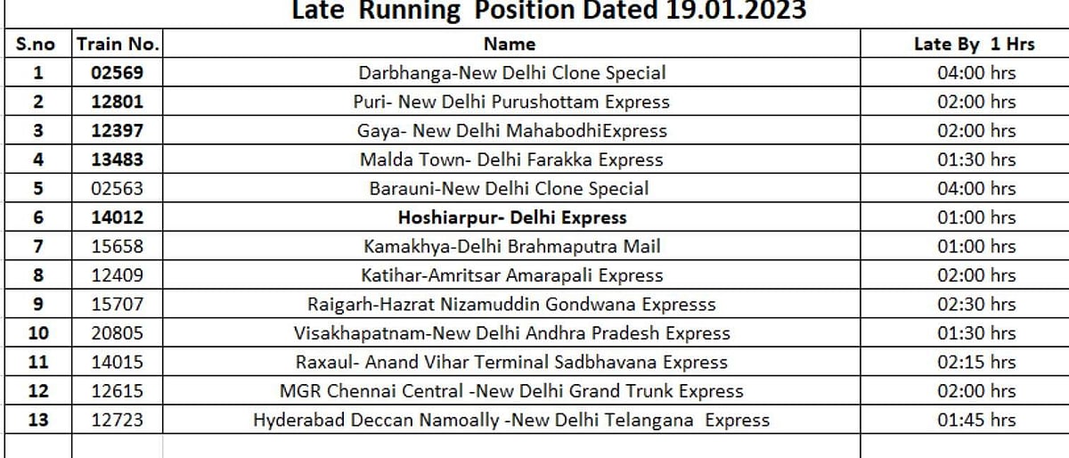 கடும் பனிமூட்டம் காரணமாக வடமாநிலங்களில் இன்று 13 ரயில்கள் தாமதம் ஆவதாக ரயில்வே நிர்வாகம் தகவல் தெரிவித்துள்ளது.