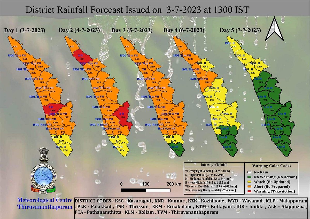 தென்மேற்கு பருவ மழை தீவிரமடைந்துள்ள நிலையில், கேரளத்தில் இன்றும், நாளையும் அதிகனமழை பெய்யும் என்பதால், சில மாவட்டங்களுக்கு சிவப்பு மற்றும் ஆரஞ்சு எச்சரிக்கை கொடுக்கப்பட்டுள்ளது.