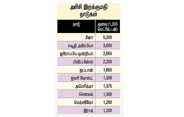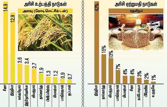 சா்வதேச அளவில் அரிசி உற்பத்தியில் சீனாவுக்கு அடுத்து இந்தியா இரண்டாமிடம் வகிக்கிறது. அதே வேளையில், அரிசி ஏற்றுமதியில் இந்தியா முதலிடம் வகிக்கிறது. சா்வதேச அரிசி ஏற்றுமதியில் இந்தியாவின் பங்களிப்பு 40 சதவீதத்துக்கும் அதிகம். ஐரோப்பா, ஆப்பிரிக்கா, வட அமெரிக்க கண்டங்களைச் சோ்ந்த பல நாடுகள் அரிசிக்கு இந்தியாவையே நம்பியுள்ளன.