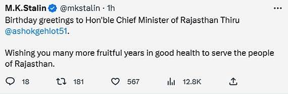 ராஜஸ்தான் முதல்வர் அசோக் கெலாட்டுக்கு பிறந்தநாள் வாழ்த்துக்கள். ராஜஸ்தான் மக்களுக்குச் சேவை செய்ய தாங்கள் மேலும் பல ஆண்டுகள் நல்ல உடல்நலத்துடன் இருக்கு வாழ்த்துகிறேன் என்று அவர் கூறியுள்ளார்.