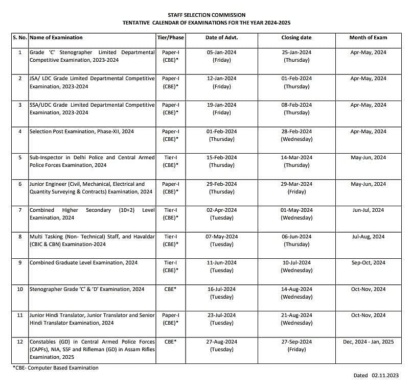 2024 ஆம் ஆண்டுக்கான தேர்வு அட்டவணையை மத்திய அரசுப் பணியாளர் தேர்வாணையம் (எஸ்எஸ்சி) வெளியிட்டுள்ளது.