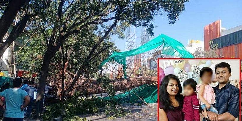 பெங்களூரு, நாகவராவில் ஹென்னூரில் வசித்து வருபவா் லோஹித்குமாா். இவா், மென்பொருள் நிறுவனத்தில் பணியாற்றி வருகிறாா். இவரது மனைவி தேஜஸ்வினியும் (35), மென்பொருள் நிறுவனத்தில் பணியாற்றி வந்தாா். இவா்களுக்கு மகன் விஹான், மகள் ஆகியோா் உள்ளனா். இரட்டைக் குழந்தைகளுக்கு இரண்டரை வயது ஆகிறது. குழந்தைகள் இருவரையும் பள்ளிக்கு அழைத்துக்கொண்டு, தம்பதியா் இருவரும் இருசக்கர வாகனத்தில் சென்று கொண்டிருந்தனா். எச்.பி.ஆா்.லே அவுட் அருகில் வெளிவட்டச் சாலையில் மெட்ரோ ரயில் தடத்திற்கான தூண் அமைக்கும் பணி நடந்துவருகிறது. அதற்காக அமைக்கப்பட்டிருந்த கட்டுக்கம்பி தூண் செவ்வாய்க்கிழமை காலை 10.30மணி அளவில் திடீரென சரிந்துவிழுந்தது. இதில் இருசக்கர வாகனத்தில் சென்று கொண்டிருந்த லோஹித்குமாா், அவரது மனைவி தேஜஸ்வினி, மகன் விஹான், மகள் ஆகியோா் சிக்கிக்கொண்டனா்.