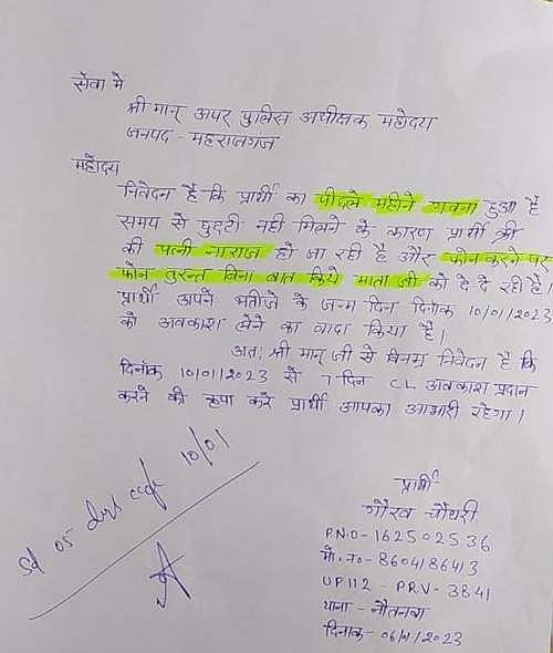லக்னௌ: உத்தரப்பிரதேச மாநிலம் மஹராஜ்கஞ்சில் புதிதாக திருமணமான காவலரின் விடுப்பு விண்ணப்பம் சமூக வலைதளங்களில் வைரலாக பரவி வருகிறது.