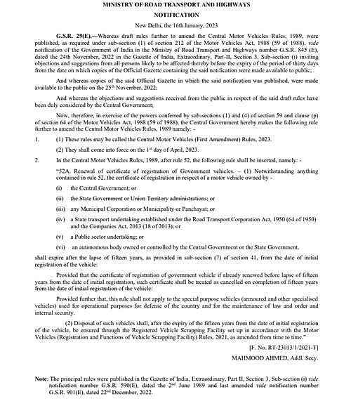 மேற்கண்ட அலுவலகங்களில் பதினைந்து ஆண்டுகளுக்கு மேலாகப் பயன்பாட்டில் உள்ள வாகனங்கள் 2023 ஏப்ரல் முதல் அழிக்கப்படும் என்றும், மேலும், அவற்றிற்குரிய பதிவுகளும் புதுப்பிக்கப்படாது என மத்திய மோட்டார் வாகன சட்டத்தில் திருத்தம் செய்வதற்கான அறிவிப்பை அமைச்சகம் வெளியிட்டுள்ளது.