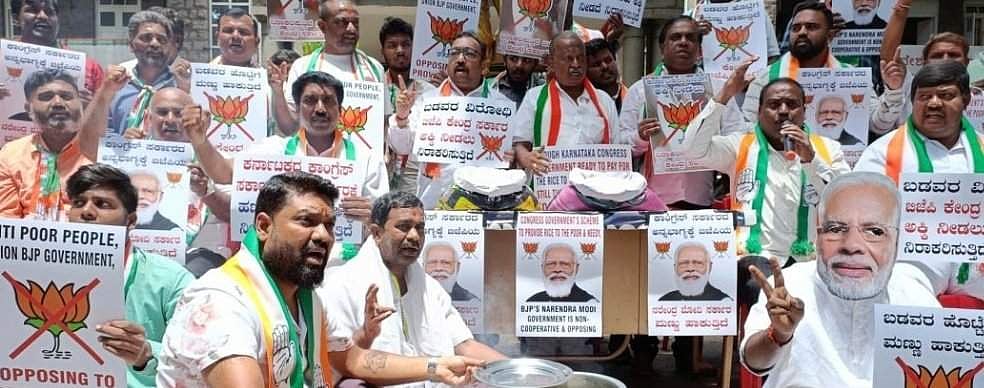 கர்நாடக மாநிலத்திற்கு அரிசி வழங்காத மத்திய அரசைக் கண்டித்து காங்கிரஸ் கட்சியினர் போராட்டம் நடத்தி வருகின்றனர்.