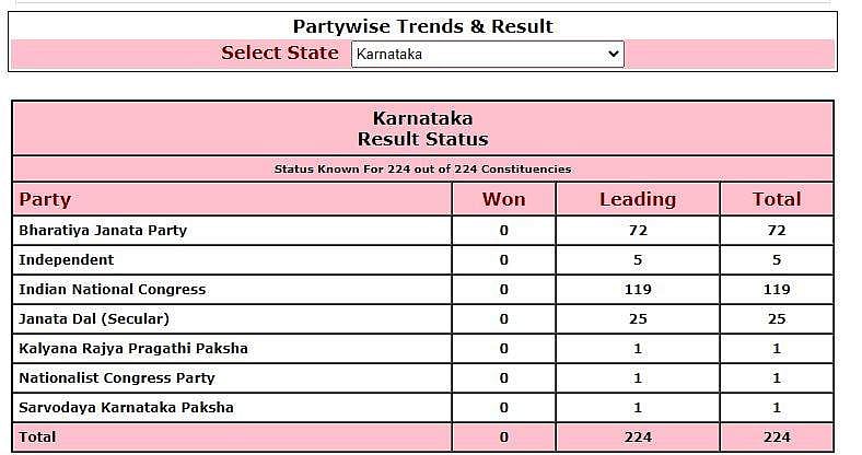 தேர்தல் ஆணையம் வெளியிட்டுள்ள முடிவுகளின்படி காங்கிரஸ் 119 இடங்களில் முன்னிலை பெற்று வருகிறது.