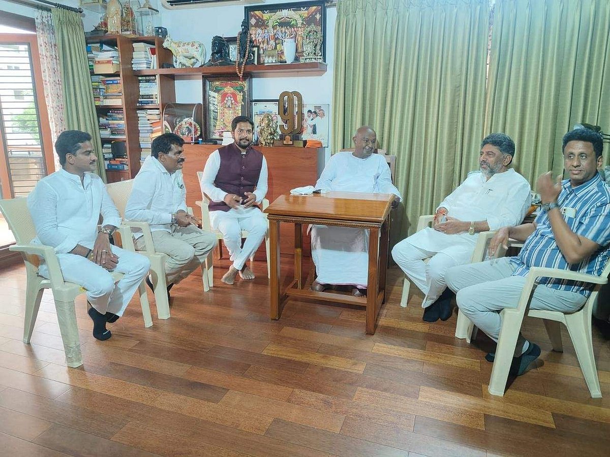 இந்நிலையில், மதச்சாா்பற்ற ஜனதா தளம் கட்சியின் நிறுவனர் தேவெகெளடாவை, அவரது இல்லத்தில் சிவகுமார் சந்தித்து பேசினார்.