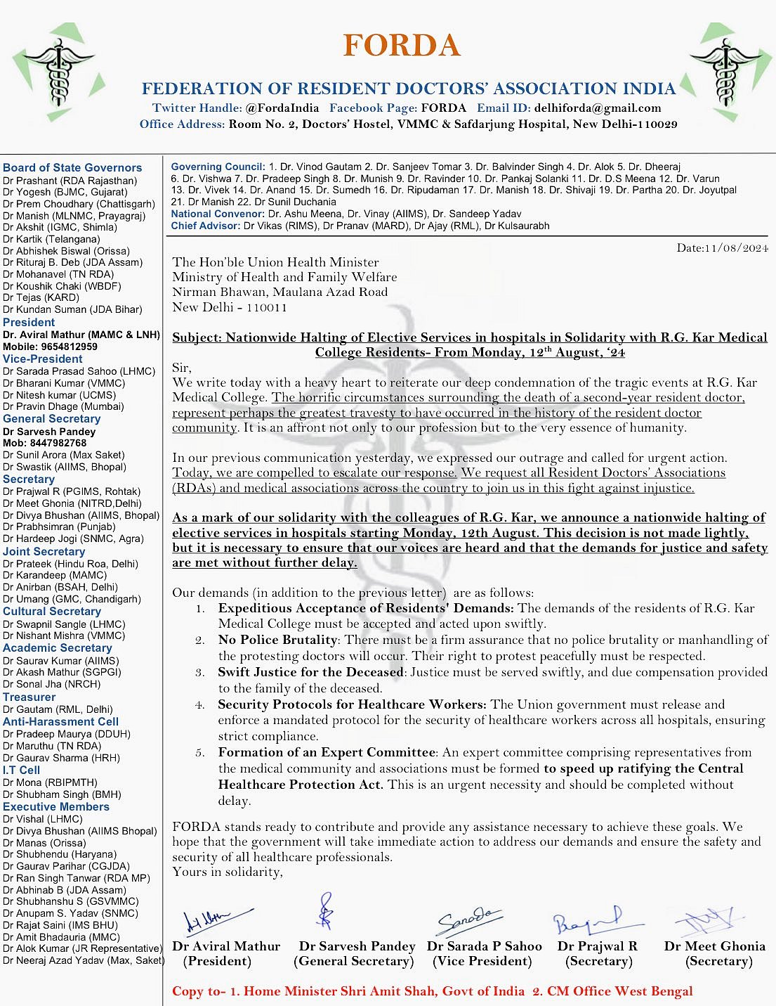 மருத்துவர்கள் சங்கம் இன்று(ஆக. 11) வெளியிட்டுள்ள அறிக்கையில், மருத்துவர் கொலைக்கு கண்டனம் தெரிவித்து நாளை முதல் நாடு தழுவிய போராட்டத்தில் ஈடுபடப் போவதாக தெரிவிக்கப்பட்டுள்ளது. அதன்படி, அத்தியாவசிய, அவசர சிகிச்சைகளைத் தவிர பிற பிரிவுகளில் மருத்துவர்கள் எவரும் பணியாற்றப் போவதில்லை.