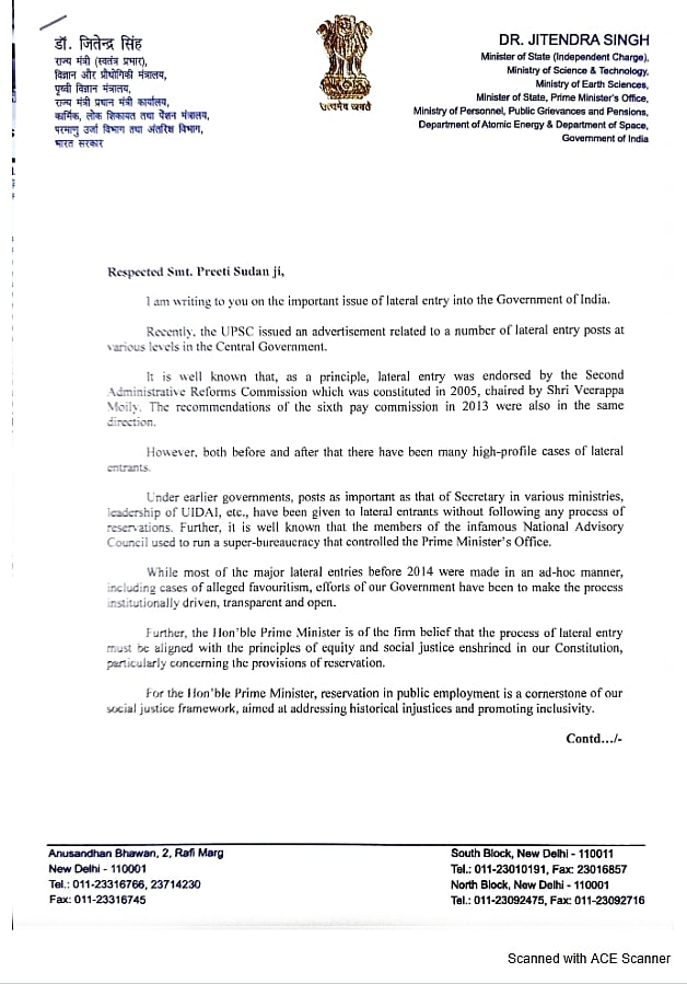 இதற்கு முந்தைய காங்கிரஸ் அரசு, எவ்வித இட ஒதுக்கீட்டு முறைகளையும் பின்பற்றாமல், நேரடி நியமனங்கள் மூலம் மிக முக்கிய அமைச்சகங்களின் செயலாளர்கள், குறிப்பாக உதைய் அமைப்பின் தலைவர் பொறுப்பைக் கூட நியமித்திருக்கிறது என்று குறிப்பிட்டுள்ளார்.