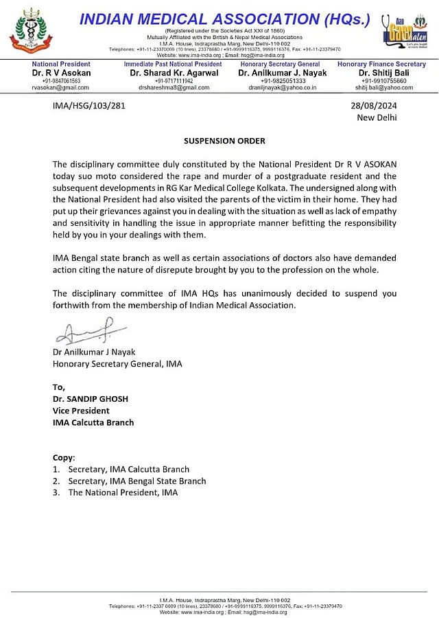 இந்திய மருத்துவ சங்கத்தின் உறுப்பினர் பதவியில் இருந்து ஆர்ஜி கர் மருத்துவக் கல்லூரி மருத்துவமனையின் முன்னாள் முதல்வர் நீக்கப்பட்டுள்ளார்.