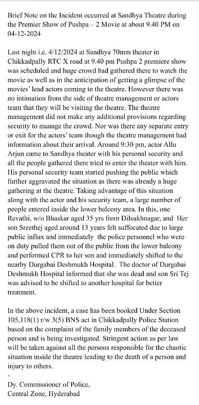 அல்லு அர்ஜூனை தவிர்த்து, அதிகளவிலான கூட்டத்தை ஹைதராபாத் சந்தியா தியேட்டர் மீதும் வழக்குப்பதிவு செய்யப்பட்டுள்ளது.