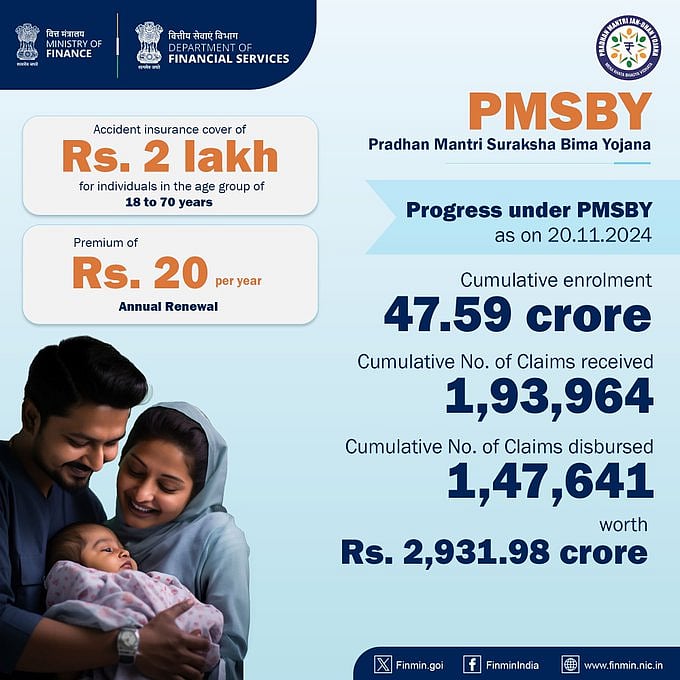 பிரதம மந்திரி சுரக்ஷா பீமா (PMSBY) விபத்து காப்பீடு திட்டத்தின்கீழ், இதுவரையில் 47.59 கோடி பதிவு செய்துள்ளதாகவும், பெறப்பட்ட மொத்த உரிமைகோரல்களின் எண்ணிக்கை 1,93,964 என்றும், வழங்கப்பட்ட மொத்த உரிமைகோரல்களின் எண்ணிக்கை 1,47,641 என்றும் நிதி அமைச்சகம் தெரிவித்துள்ளது.