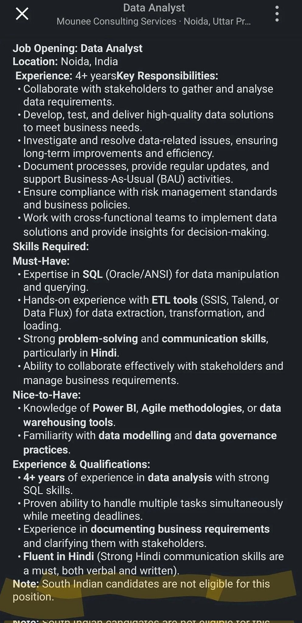 நொய்டாவை மையமாக கொண்டு இயங்கும் தனியார் நிறுவனத்தின் வேலைவாய்ப்பு விளம்பரத்தில் தென்னிந்தியர்கள் தகுதியில்லை என்று குறிப்பிட்டுள்ளது.