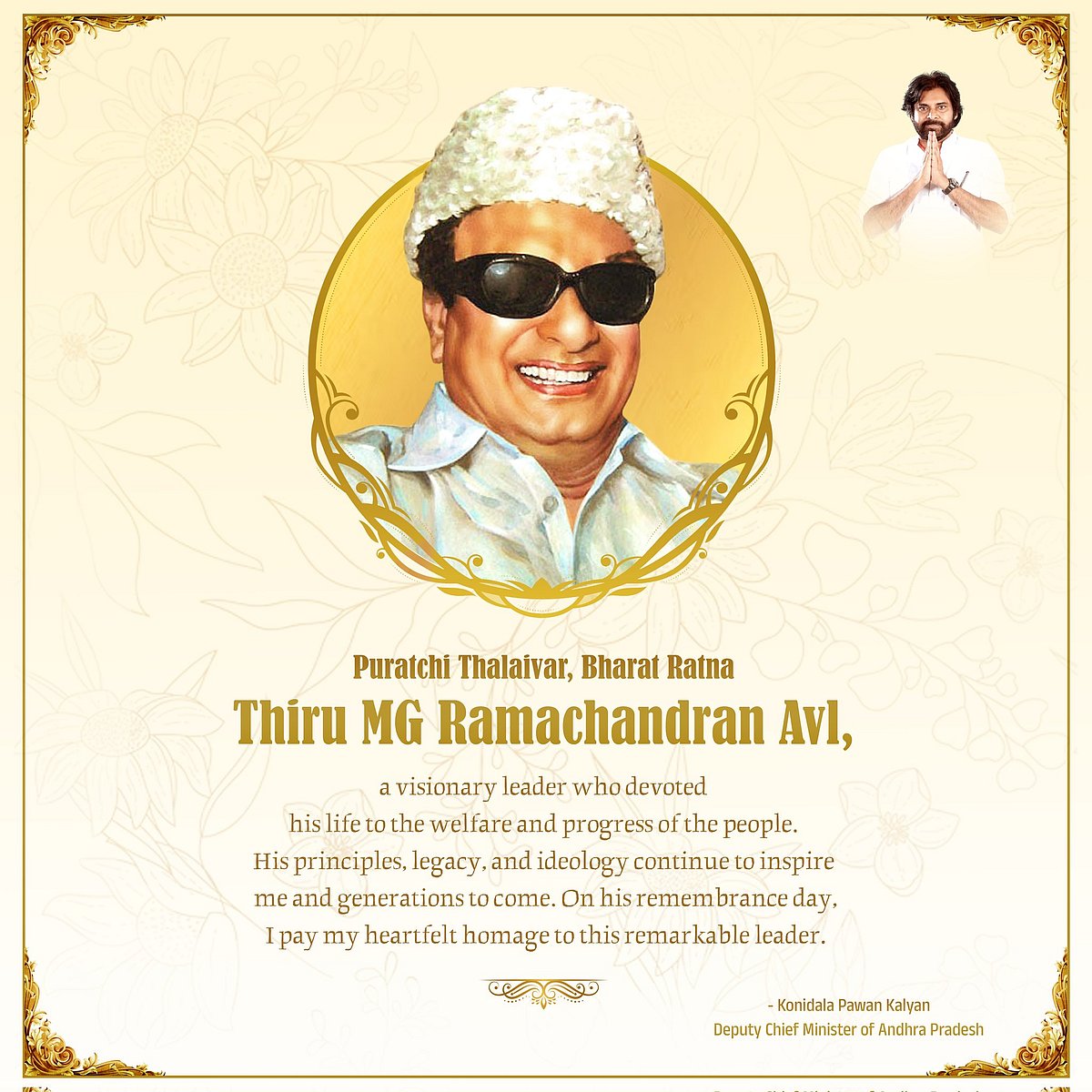 ஆந்திர பிரதேச துணை முதல்வர் பவன் கல்யாண் தமிழக முன்னாள் முதல்வர் மறைந்த எம்ஜிஆரை அவரது நினைவுநாளான இன்று(டிச. 24) நினைவுகூர்ந்து பதிவிட்டுள்ளார்.
