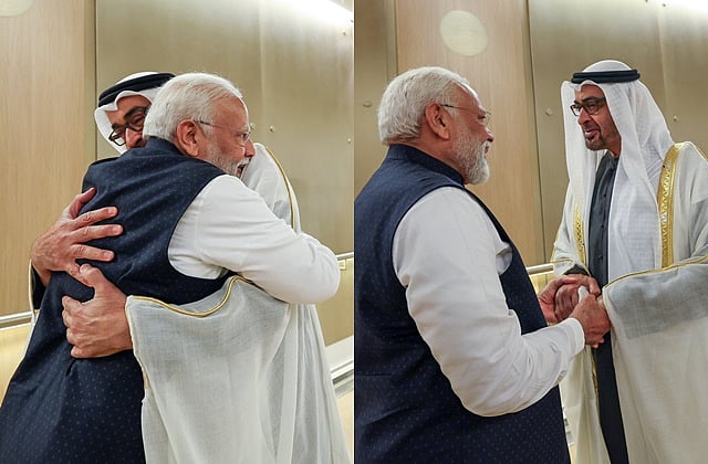 ஐக்கிய அரபு அமீரக அதிபர் ஷேக் முகமது பின் ஜயத் அல் நஹ்யான் பிரதமர் நரேந்திர மோடியை வரவேற்றார்.