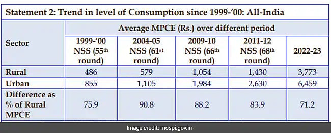 அதில், 2022-23 ஆண்டில் கிராமப்புற குடும்பங்களின் மாத செலவு ரூ. 3,773 என்றும் நகர்ப்புறங்களில் ரூ. 6,459 என்றும் தரவுகள் குறிப்பிடுகின்றன.