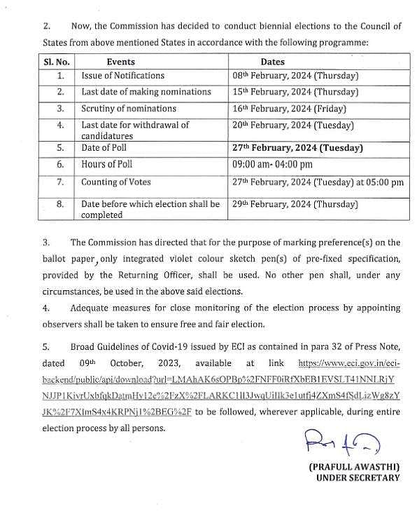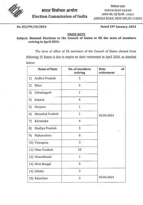 முன்னாள் பிரதமா் மன்மோகன் சிங், பாஜக தேசியத் தலைவா் ஜெ.பி.நட்டா, ரயில்வே அமைச்சா் அஸ்வினி வைஷ்ணவ், மத்திய கல்வித் துறை அமைச்சா் தா்மேந்திர பிரதான், சுற்றுச்சூழல் துறை அமைச்சா் பூபேந்திர யாதவ், சுகாதாரத் துறை அமைச்சா் மன்சுக் மாண்டவியா, மீன்வளத் துறை அமைச்சா் பா்ஷோத்தம் ரூபாலா, வெளியுறவுத் துறை இணையமைச்சா் வீ.முரளீதரன், மத்திய தகவல் மற்றும் ஒலிபரப்புத் துறை இணையமைச்சா் எல்.முருகன், முன்னாள் அமைச்சா் பிரகாஷ் ஜாவடேகா் உள்பட ஏப்ரலில் பதவிக் காலம் முடிவடையும் 56 எம்.பி.க்களின் இடங்களுக்கு அடுத்த மாதம் 27-ஆம் தேதி தோ்தல் அறிவிக்கப்பட்டுள்ளது. இதற்கான வேட்புமனுத் தாக்கல் வரும் 8-ஆம் தேதி தொடங்கவுள்ளது.