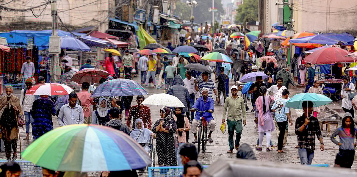 சார்மினார் பகுதியில் கொட்டும் மழையில் குடைகளை விரித்தபடி சென்ற மக்கள்
