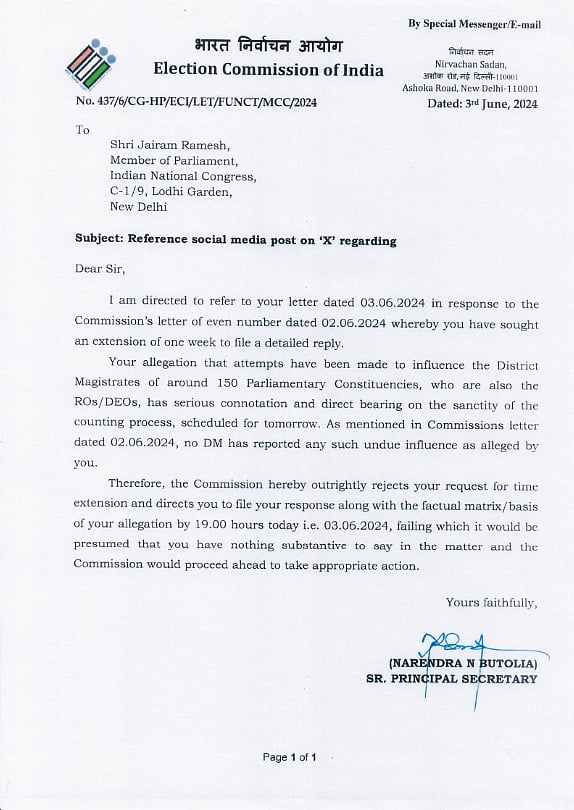 ஜெய்ராம் ரமேஷ் தரப்பில் ஒரு வாரம் அவகாசம் கோரப்பட்ட நிலையில், அதனை நிராகரித்து இன்று இரவு 7 மணிக்குள் பதில் அளிக்குமாறு தேர்தல் ஆணையம் கடிதம் எழுதியுள்ளது.