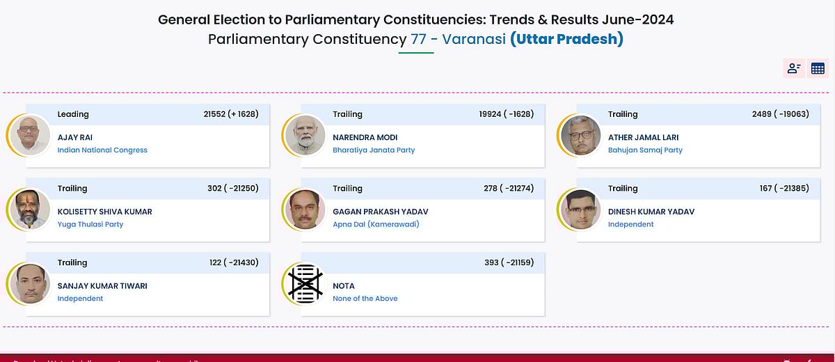 வாரணாசி தொகுதியில் முதல்கட்ட வாக்குகள் எண்ணப்பட்டு வரும் நிலையில் பிரதமர் நரேந்திர மோடி பின்னடைவை சந்தித்துள்ளார். காங்கிரஸ் வேட்பாளர் அஜய்ராய் 6000 வாக்குகள் முன்னிலையில் உள்ளார்.