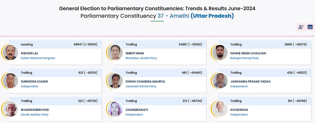 உத்தரப்பிரதேச மாநிலம் அமேதியில், ஸ்மிருதி இரானி பின்னடைவை சந்தித்துள்ளார். காங்கிரஸ் வேட்பாளர் கிஷோரி லால் முன்னிலையில் உள்ளார். இவர் ஸ்மிருதி இரானியை விட 3 ஆயிரம் வாக்குகள் அதிகம் பெற்றுள்ளார்.