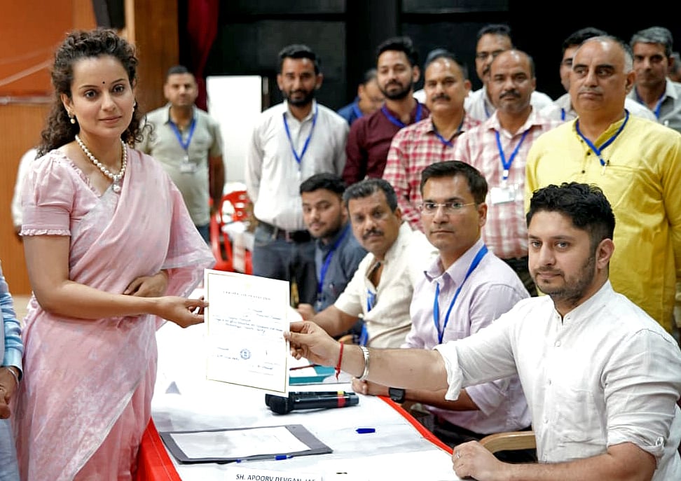 ஹிமாச்சல் பிரதேசம் மண்டி தொகுதியில் வெற்றி பெற்றதையடுத்து அதற்கான சான்றிதழை தேர்தல் அதிகாரிகளிடமிருந்து பெற்றுக் கொள்கிறார் பாலிவுட் நடிகையும் பாஜக வேட்பாளருமான கங்கனா ரணாவத்.