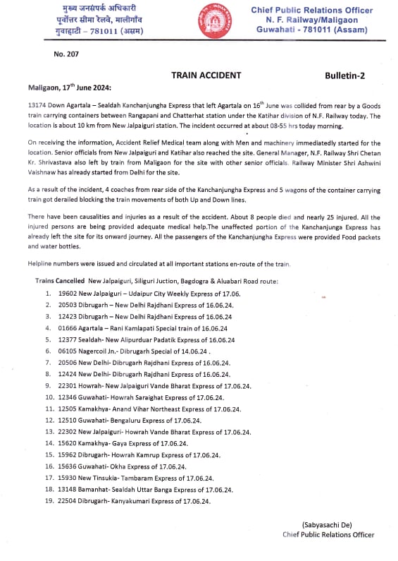 மேற்கு வங்கத்தின், டார்ஜிலிங் மாவட்டத்தில் உள்ள நியூ ஜல்பைகுரி அருகே கஞ்சன்ஜங்கா விரைவு ரயில் (வண்டி எண்: 13174) மீது பின்னால் வந்த சரக்கு ரயில் மோதி இன்று (ஜூன் 17) விபத்துக்குள்ளானது.