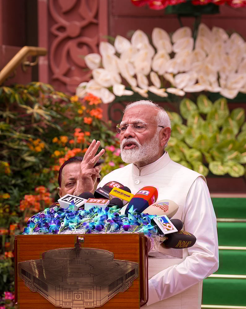 நாடாளுமன்ற வளாகத்துக்கு வெளியே செய்தியாளர்கள் மத்தியில் பிரதமர் நரேந்திர மோடி பேசினார்.