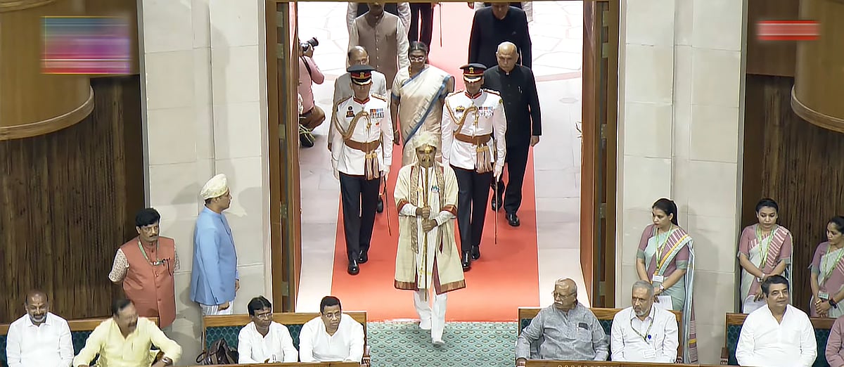 முன்னதாக, குதிரைப் படை அணிவகுப்புடன் குடியரசுத் தலைவா் மாளிகையில் இருந்து நாடாளுமன்றத்துக்கு திரௌபதி முர்மு அழைத்துவரப்பட்டார்.