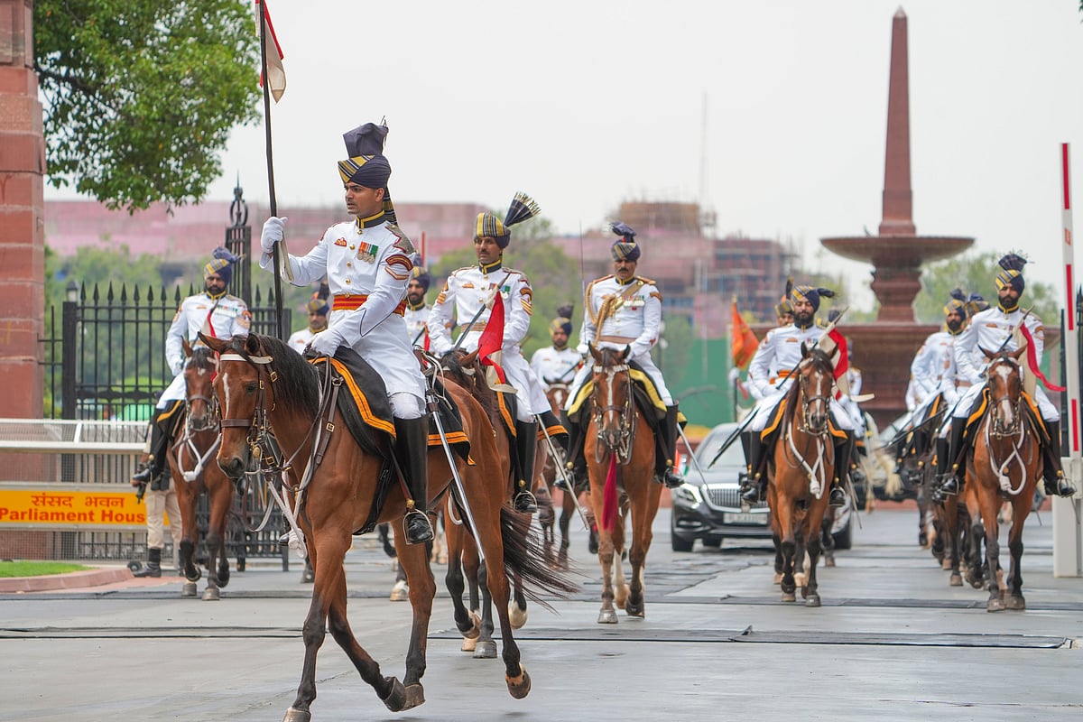 முன்னதாக, குதிரைப் படை அணிவகுப்புடன் குடியரசுத் தலைவா் மாளிகையில் இருந்து நாடாளுமன்றத்துக்கு திரௌபதி முர்மு அழைத்துவரப்பட்டார்.