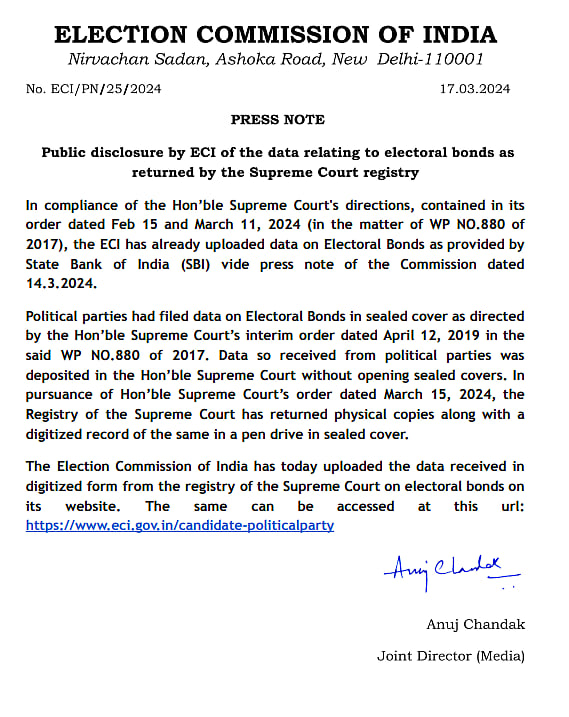 இது தொடர்பாக இந்திய தேர்தல் ஆணையம் வெளியிட்டுள்ள அறிக்கையில், உச்சநீதிமன்ற பதிவகத்திலிருந்து சீலிடப்பட்ட உரையில் தேர்தல் பத்திர நன்கொடை விவரங்களை பென்டிரைவில் டிஜிட்டல் மயமாகவும், அச்சிட்டு காகிதங்களாகவும் பெறப்பட்டது.